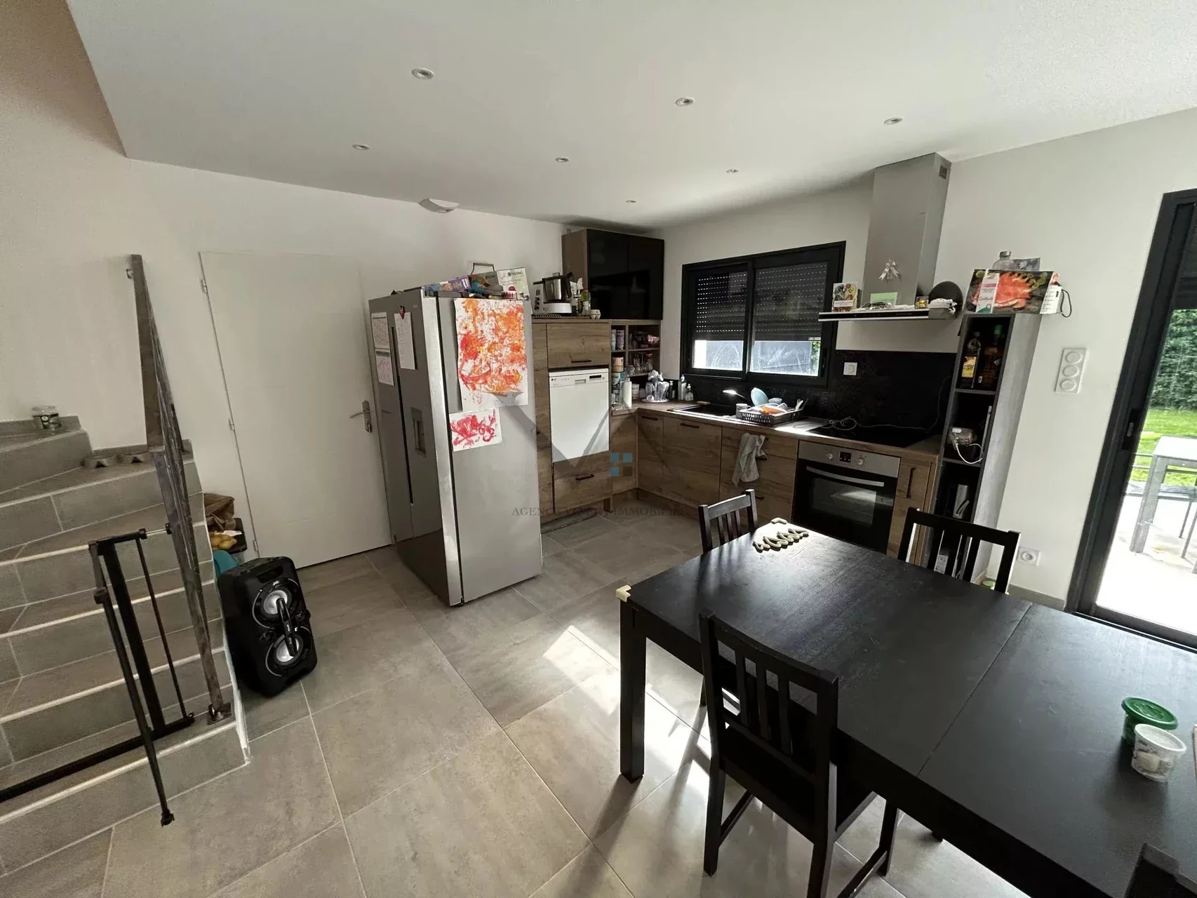 - Au rez-de-chaussée : une belle pièce à vivre de 47 m² avec une cuisine entièrement équipée ouverte ouvrant/terrasse et jardin, un cellier, un WC. Le garage est attenant à la cuisine et directement accessible par le jardin.