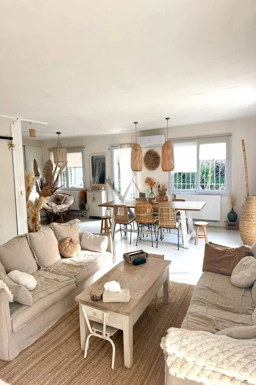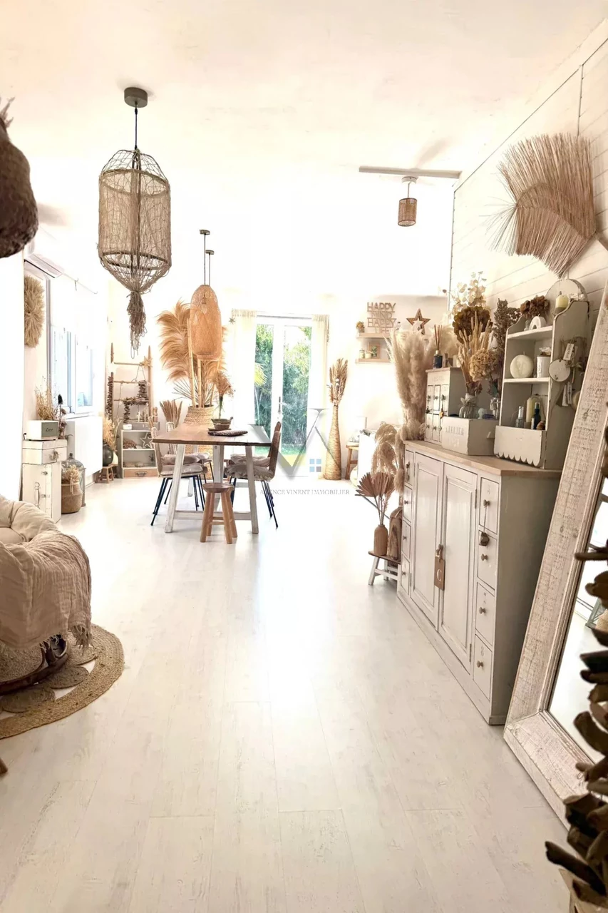La vaste pièce de vie, exposée plein sud, bénéficie d’une lumière naturelle omniprésente et s’ouvre harmonieusement sur l’extérieur, offrant un espace convivial et chaleureux.