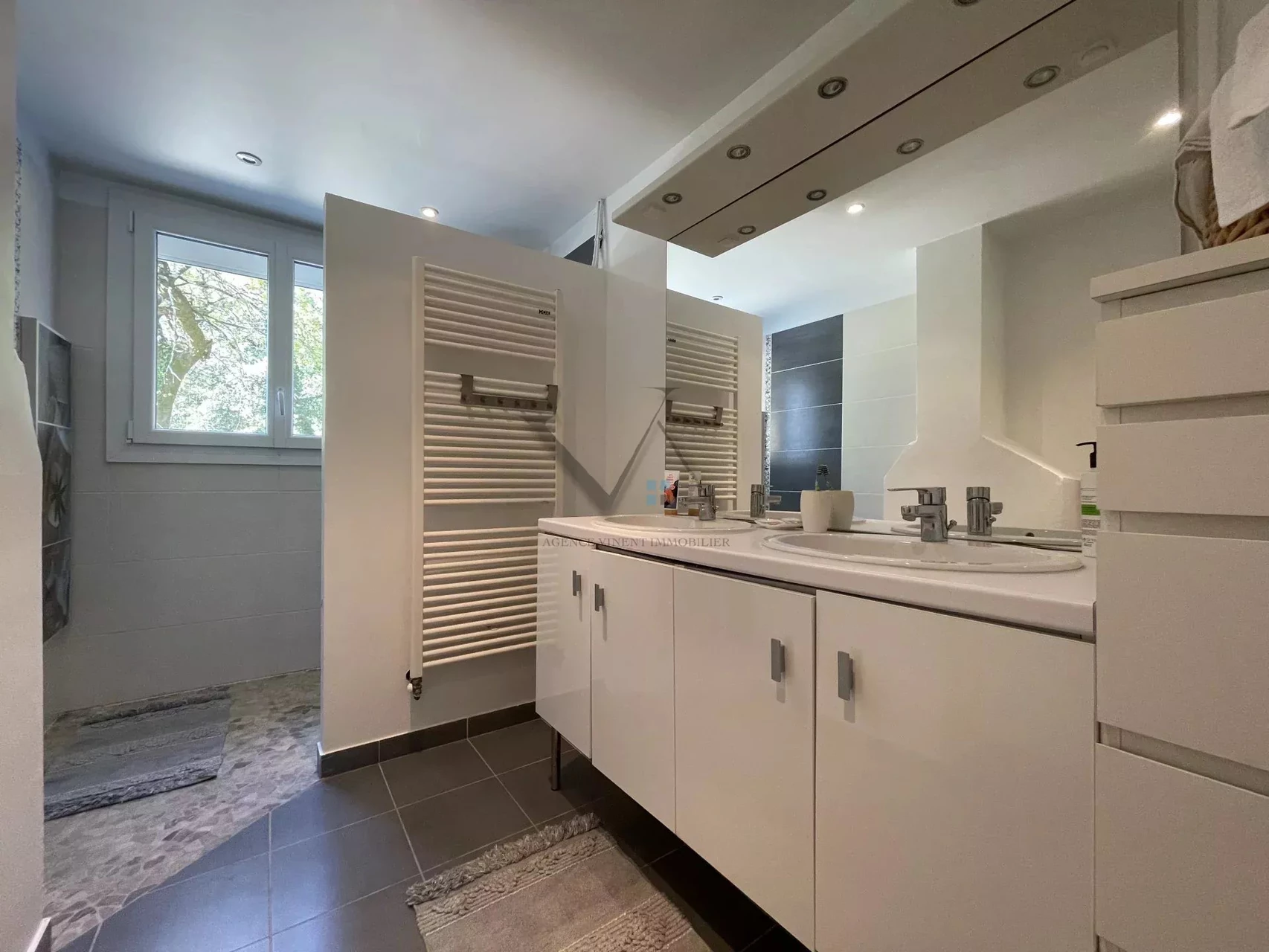 A l'étage, un espace bureau sur le palier de 20 m² et une chambre donnant sur une terrasse privée. Une salle de bain, une salle de jeux / cinéma de 28 m², une buanderie, deux chambres de 11 m² et des toilettes séparées.